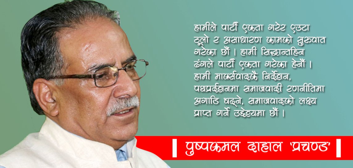 हामीले पार्टी एकता गरेर एउटा ठूलो र असाधारण कामको सुरुवात गरेका छौं । हामी सिद्धान्तहिन ढंगले पार्टी एकता गरेका हेनौं । हामी माक्र्सवादकै निर्देशन, पथप्रर्दशनमा समाजवादी रणनीतिमा अगाडि बढ्ने, समाजवादको लक्ष्य प्राप्त गर्ने उद्देश्यमा छौं ।