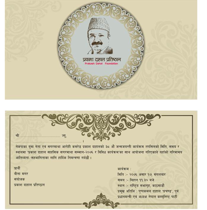 अध्यक्ष प्रचण्डको प्रमुख आतिथ्यमा हुने उक्त कार्यक्रम राष्टिय सभा गृहमा बिहान ११:३० बजे शुरु हुने आयोजकले जनाएका छन् । स्वर्गीय दाहाल अध्यक्ष प्रचण्डको स्वकीय सचिव तथा तत्कालिन माओवादी केन्द्रका पोलिटब्यूरो सदस्य समेत थिए ।