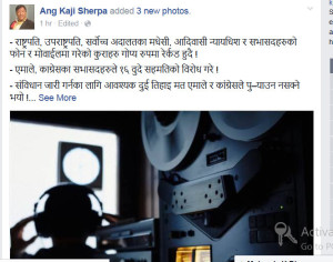 \"बलनपबवष\"८ असार काठमाडौं । विवादास्पद अभिव्यक्ति दिँदै आएका जनजाती नेता आङ्काजी शेर्पाले राष्ट्रपति,उपराष्ट्रपति लगायत जनजाती र मधेसी नेताको फोन रेकर्ड भएको खुलासा गरेका छन् । उनले फोन रेकर्डको आधारमा राष्ट्रपति ,उपराष्ट्रपति तथा न्यायधिस गिरिसचन्द्र लाल माथी महाअभियोग लगाउने तयारी भएको समेत उल्लेख गरेका छन् । सामाजिक सञ्जाल फेसबुकमा स्ट्याटस लेख्दै शेर्पाले १६ बुँदे सहमतिको विरोध गर्नेहरुलाई काँग्रेस एमालेका नेताहरुले फोन रेकर्डका आधारमा कार्वाही गर्न लागेको बताएका हुन् । ‘१६ वुदे सहमतिको विरोध गर्ने राष्ट्रपति, उपराष्ट्रपति, सर्वोच्च अदालतका मधेसी, आदिवासी न्यायधिश र सभासदहरुको फोन र मोवाईलमा गरेको कुराहरु एमाले र कांग्रेसको निर्देशनमा गोप्य रुपमा रेर्कड हुदै गरेको दावी नाम उल्लेख नगर्ने सर्तमा कांग्रेस र एमालेका सभासदहरूले गरेका छन् ।’ उनले सामाजिक सञ्जाल फेसबुकमा लेखेका छन्, ‘यदि आवश्यक परे महाअभियोग लगाएर मधेसीमूलका राष्ट्रपति, उपराष्ट्रपति र न्याधिश गिरिसचन्द्र लाल निलम्वन गर्ने एमाले र कांग्रेस तयारी रहेको एमालेका मधेसीमुलक सभासदले भनाई रहेको छ ।’ केही दिन अघि शेर्पाले एमाओवादी अध्यक्ष प्रचण्डको ज्यान मार्ने धम्कीपूर्ण स्ट्याटस लेखेपछि निकै विवादीत बनेका थिए । राष्ट्रपति र उपराष्ट्रपति सहित फोन रेकर्ड गर्ने सामग्रीको तस्विर सहित उनले लेखेको स्ट्याटसको स्ट्याटस यस्तो छ : - राष्ट्रपति, उपराष्ट्रपति, सर्वोच्च अदालतका मधेसी, आदिवासी न्यायधिश र सभासदहरुको फोन र मोवाईलमा गरेको कुराहरु गोप्य रुपमा रेर्कड हुदै ! - एमाले, काग्रेसका सभासदहरुले १६ वुदे सहमतिको विरोध गरे ! - संविधान जारी गर्नका लागि आवश्यक दुई तिहाइ मत एमाले र कांग्रेसले पु–याउन नसक्ने भयो !
