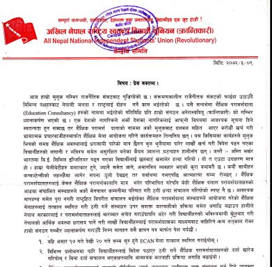 \"student\"९ असार काठमाडौं ।  शैक्षिक परामर्शदाताहरुले गर्न लागेको शैक्षिक मेला रोक्न विप्लव नेतृत्वको नेकपा माओवादी निकट विद्यार्थी संगठन अखिल (क्रान्तिकारी)ले अल्टिमेटम दिएको छ । शैक्षिक परामर्शको नाममा विद्यार्थीको किनबेच गरेको भन्दै उनीहरुले मेला तुरुन्त रोक्न माग गरेका छन्  । यहि असार १७ गते देखि २० गते सम्म हुन लागेको इक्यानको मेला रोक्न उनीहरुले माग गरेका छन् । ‘शैक्षिक परामर्शदाताको नाममा विद्यार्थीहरु माथी दलाली गरेर मेनपावरको काम गर्दै आएका छन्  । जारि विज्ञप्तिमा भनिएको छ, ‘ आवश्यक मापदण्ड पुरा नगरि राष्ट्रहित विपरित सञ्चालन भइरहेका  शैक्षिक परामर्शदाता संस्थाहरुले आयोजना गरेको मेला तत्काल स्थगित गर्न तथा ठगि गर्ने माथी तत्काल कार्वाही गर्न नेपाल सरकार समक्ष हामी आग्रह गर्दछौं ।’   विभिन्न प्रलोभन देखाएर शैक्षिक परामर्शदाताले विद्यार्थीलाई ठगि गर्ने गरेको भन्दै उनीहरुले त्यस्तो संस्थाको दर्ता खोरेजिको माग समेत गरेका छन् । आफूहरुले मेला स्थगित गर्न बारम्बार आग्रह गर्दापनि मेला स्थगित नगरे त्यसको जिम्मेवार आफै हुने चेतावानी उनीहरुले दिएका छन् ।
