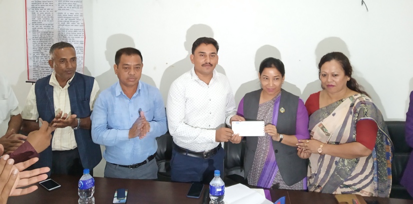 रंगशाला निर्माणको लागि भरतपुर महानगरले ५० लाखको चेक हस्तान्तरण गरेपछि प्रमुख प्रशासकीय अधिकृत नेत्र सुवेदीले व्यक्तिगत रुपमा एक लाख ५१ हजार १५१ रुपैयाँको चेक फाउन्डेसनका अध्यक्ष धुर्मुसलाई हस्तान्तरण गरे ।