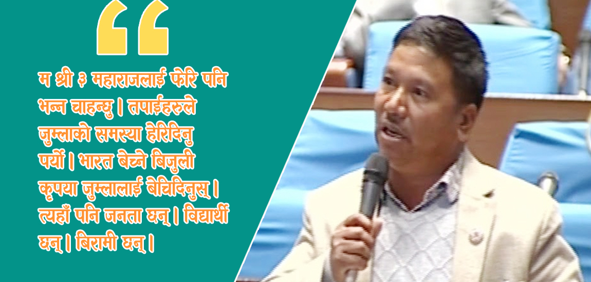 म श्री ३ महाराजलाई फेरि भन्न चाहन्छु । तपाईहरुले जुम्लाको समस्या हेरिदिनुपर्यो । अहिले डिजेल प्लान्ट राख्न खोजिरहेका छौं । एक महिनामा कम्तिमा १० लाखदेखि १५ लाख खर्च आउँछ ।