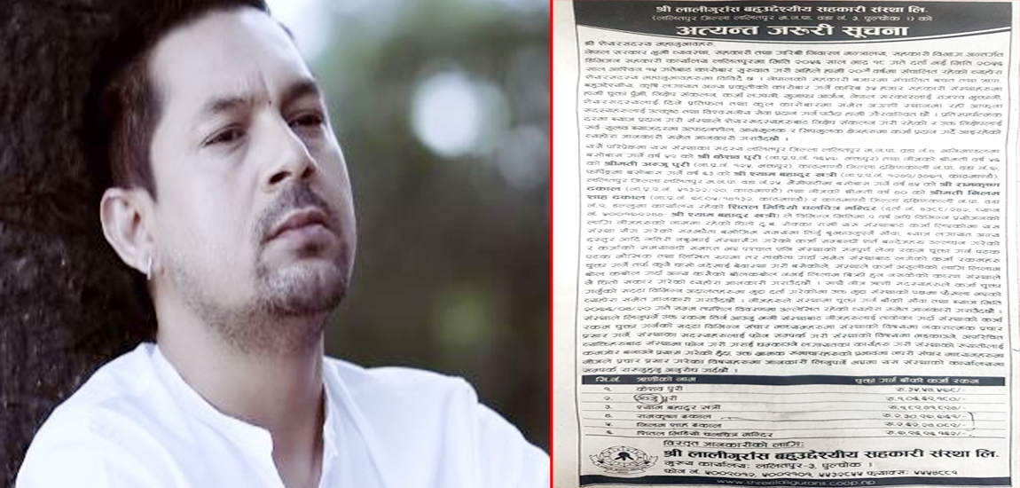 काठमाडौं । गायक रामकृष्ण ढकाल र उनकी पत्नी निलम शाहले करिब ५ करोड ऋण नतिरेको भन्दै ललितपुरस्थित एक सहकारीले संस्थाले सूचना प्रकाशित गरि पैसा तिर्न ताकेता गरेको छ । सहकारीले ९ वर्ष अगाडि लिएको ऋण नतिरी उल्टै धम्की दिएको भन्दै एक दैनिक पत्रिका मार्फत सूचना नै सार्वजनिक गरि ताकेता गरेकाे हाे ।