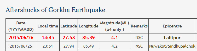 \"earthquake\"११ असार, काठमाडौं । शुक्रबार अपराह्न २ बजेर ४५ मिनेट जाँदा ललितपुर गोदावरी केन्द्रविन्दु भएको ४।१ म्याग्निच्युडको परकम्प महसुस गरिएको छ । खानी तथा भूगर्भ विभाग, राष्ट्रिय भूकम्प मापन केन्द्रका अनुसार गत वैशाख १२ गतेको ‘गोरखा भूकम्प’ पछि अहिलेसम्म चार म्याग्निच्युडमाथिका ३०० भन्दा बढी परकम्प गइसकेको छ ।