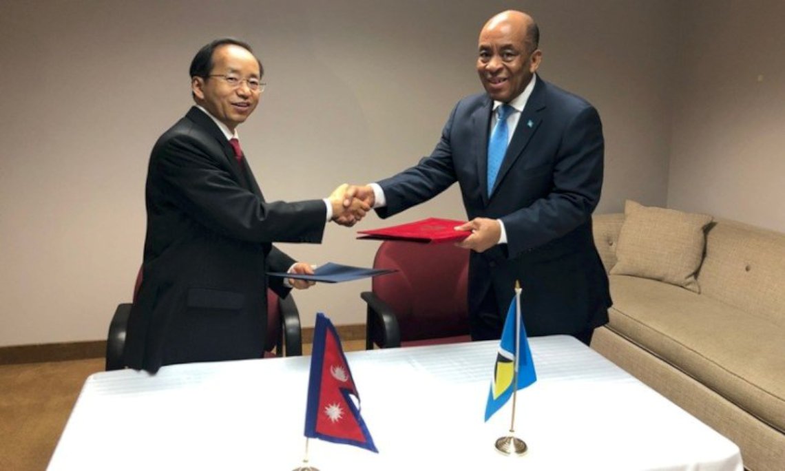 कूटनीतिक सम्बन्ध स्थापना गर्नेसम्बन्धी संयुक्तपत्रमा संयुक्त राष्ट्रसङ्घका लागि नेपालका स्थायी प्रतिनिधि अमृतबहादुर राई र सोही विश्व संस्थाका लागि सेन्ट लुसियाका स्थायी प्रतिनिधि कसमस रिचर्डसनले आज न्यूयोर्कमा आयोजित एक संक्षिप्त समारोहमा हस्ताक्षर गरे ।