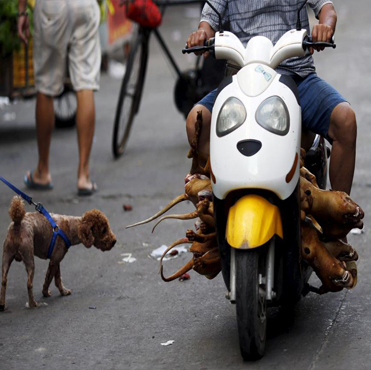 एक पर्वका लागि घर पालुवा कुकुर नजिकैबाट मारिएको कुकुर लिएर जाँदै गरेको स्कुटर । तस्बिरः रोयटर्स \"butchered