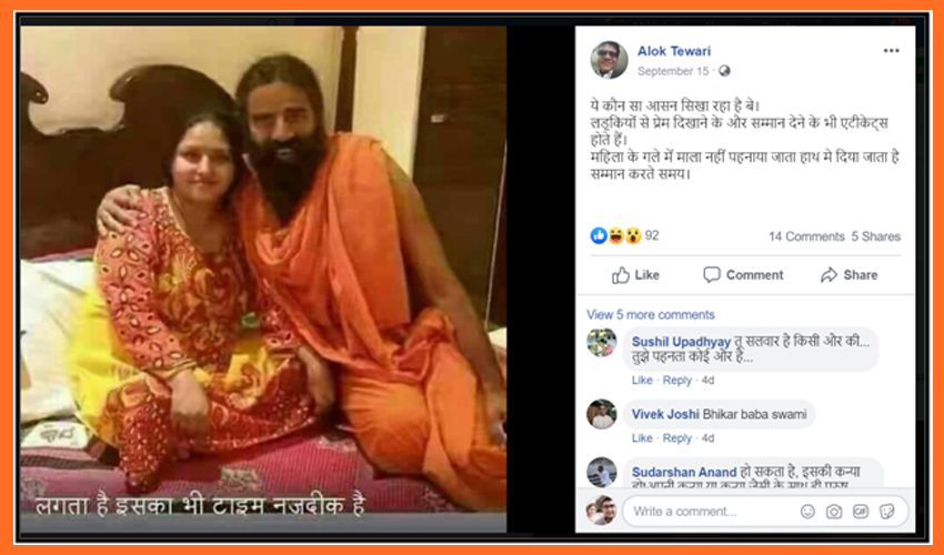 फेसबुकमा योगगुरु रामदेवको तस्बीर पोष्ट गर्दै लेखिएको छ, “यो कुन आसन सिकाइरहेका छन् बाबा ? युवतीहरुलाई माया र आदर देखाउँदै पनि छन् । तर सम्मान गर्दा महिलालाई माला लगाईँदैन् हातमा दिइन्छ ।”