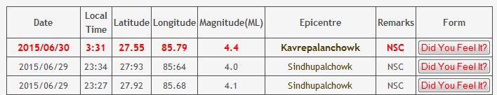 \"Kavre\"१५ असार, काठमाडाैं । आज बिहानै काठमाडौं नजिकै रहेको काभ्रेलाई केन्द्र बनाएर भूकम्पको झड्का गएको छ । राष्ट्रिय भूकम्पमापन केन्द्रका अनुसार आज बिहान ३ बजेर ३१ मिनेटमा काभ्रेलाई केन्द्रबिन्दु बनाएर ४.४ रेक्टरस्केलको पराकम्पन गएको हो । गएराती पनि सिन्धुपाल्चोकलाई केन्द्र बनाएर सात मिनेटको अन्तरमा चार रेक्टरमाथिका दुई पराकम्पन गएका थिए । राती ११ बजेर २७ मिनेटमा ४.१ र ११ बजेर ३४ मिनेटमा ४ रेक्टरस्केलको पराकम्पन गएको हो । हिजो बिहान पनि रामेछापलाई केन्द्र बनाएर ५ रेक्टरस्केलको पराकम्पन गएको थियो ।