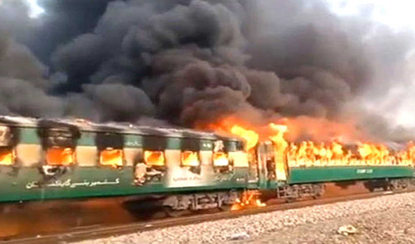 पाकिस्तानी रेल मन्त्री शेख राशिदले सिलिण्डर बिस्फोट हुँदा आगलागी भएको जनाएका छन् । घटनामा धेरैको मृत्यु कुदिरहेको अवस्थामा ट्रेनबाट हामफाल्दा भएको बताइएको छ ।