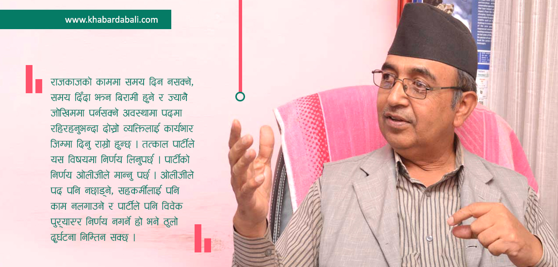 बिरामी कति गम्भिर छ ? राजकाजको कामकाज गर्न सक्छ कि सक्दैन ? उसको स्वास्थ उपचारमा कति समय लाग्छ ? यस्तो गम्भिर प्रकृतिको विषय पार्टीले निर्णय गर्नु पर्छ । राजकाजमा समय नै दिन नसक्ने मान्छेले पद ओगटेर बस्नु हुँदैन । यस्तो अवस्थामा ओली जीले तत्काल राजकाज छोड्नुपर्छ । यो विषयमा उहाँको स्वास्थ्य अवस्था हेरेर पार्टीले निर्णय लिनु पर्छ । कामै नगरी पद ओगट्ने प्रवृति राम्रो होइन । यो देशको लागि पनि दुर्भाग्य हुन्छ ।