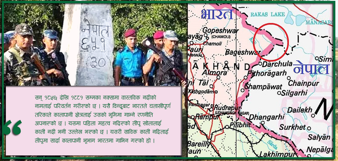 सन् १८५६ देखि १८८१ सम्मका नक्सामा वास्तविक नदीको नामलाई परिवर्तन गरीएको छ । यसै विन्दुबाट भारतले चलाखीपूर्ण तरिकाले कालापानी क्षेत्रलाई उसको भूमिमा गाभ्ने रणनीति अपनाएको छ । यसमा पहिला महत्व नदिएको लीपू खोलालाई काली नदी भनी उल्लेख भएको छ । यसरी साविक काली नदिलाई लीपूमा सार्दा कालापानी भूभाग भारतमा गाभिन गएको डाक्टर केसीको तर्क रहेको छ ।