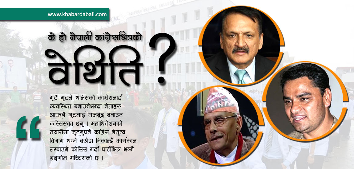 गुटै गुटले थलिएको कांग्रेसलाई व्यवस्थित बनाउनेभन्दा नेताहरु आफ्नै गुटलाई मजबुद बनाउन कस्सिएका छन् । महाधिवेशनको तयारीमा जुट्नुपर्ने कांग्रेस नेतृत्व विभाग थप्ने बखेडा निकालेर कार्यकाल लम्बाउने कोसिस गर्दा पार्टीभित्र झनै भ्रदगोल मच्चिएको छ ।यस्तै, १३ औं महाधिवेशनदेखि नयाँ गुट खडा गरेका पूर्वमहामन्त्रि कृष्णप्रसाद सिटौलाले दुवै पक्षलाई सहमतिमा ल्याउने प्रयास असफल भएको छ । बुधबार उनी आफंै पौडेल समूहले बोलाएको बैठकमा सहभागि भएका थिए । दुई पक्षिय समूहको विभिन्न चरणको छलफलपछि महाधिवेशनको कार्यतालिकामा सहमति नजिक पुगे पनि नेविसंघको भागबण्डामा आएर कुरा अड्किएको छ । बैठकमा वार्ता टोलीका सदस्यहरुले गरेको ब्रिफिङअनुसार अरु विषयमा सहमति जुटे १४ औं महाधिवेशनको कार्यतालिका बनाउन संस्थापन पक्ष सहमत देखिएको छ । पौडेल समूहले मंसिरमा महाधिवेशन गरौं भनेको छ भने संस्थापनपक्षले ०७७ फागुन प्रस्ताव गरेको छ । तर अरु विषयमा कुरा नमिलेको नेताहरुले बताएका छन् । खासगरी संस्थापन पक्षले ४१ वटा केन्द्रीय विभाग गठन गर्ने र संगठन, प्रचार, विदेश र जनसम्पर्क आफैसँग राख्ने प्रस्ताव गरेको छ । पौडेल समूहले विधानअनुसार २८ विभाग गठन गर्नुपर्ने र ५०/५० को भागबण्डा हुनुपर्ने अडान लिएको छ । यस्तै, तरुण दलमा खासै विवाद नभएपनि महाधिवेशनमा महत्वपूर्ण मानिएको नेविसंघबारे सहमति जुट्न सकेको छैन । पौडेल समूह अध्यक्ष आफैंले पाउनुपर्ने दाबी गरिरहेको छ भने संस्थापन पक्षले अध्यक्ष र महामन्त्री आफैं राखेर अन्य पद भागबण्डा गर्ने प्रस्ताव गरेको छ । तर, पौडेल समूहले अध्यक्ष आफुंले पाउनु पर्ने अडान कायमै राखेका छन् । गत भदौमा केन्द्रीय कार्यसमितिले पास गरेको नेविसंघको नेतृत्वको ३२ बर्षे हदबन्दी तत्काल लागु गर्नुपर्ने अडान राखेका छन् । मुलुककै पुरानो लोकतन्त्रवादी दाबी गर्ने नेपाली कांग्रेसमा किन बारम्बार सिद्धान्त र विधानलाई कुल्चदै भागबण्डाको राजनीतिमा अझिएको छ ? महाधिवेशन भएको दुई महिनामा गठन गर्नुपर्ने विभाग अहिलेसम्म किन गठन हुन सकेन ? के नेपाली कांग्रेसको भागबण्डा नेविसंघमा आएर अड्किएको हो ? यसै, विषयमा खबर डबलीको तर्फबाट गणेश पाण्डेले कांग्रेसका नेतात्रय डाक्टर प्रकाशशरण महत, प्रदिप पौडेल र हृदयराम थानीसँग कुराकानी गरेका छन् । कांग्रेसभित्रको भद्रगोल कसरी अन्त्य हुन्छ भनि नेतात्रयसँग गरिएको कुराकानीको सम्पादित अंश :