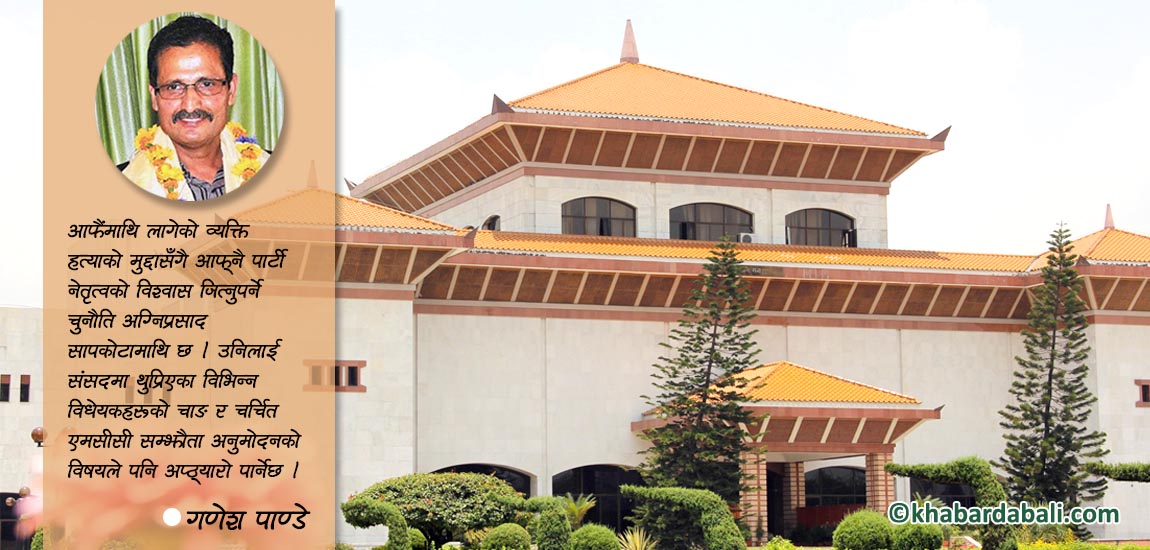 कुनै बेला संसदलाई ‘बुर्झुवाहरुले खसीको टाउको राखेर कुकुरको मासु बेच्ने थला’ भन्ने सापकोटा आफै अहिले नेतृत्व लिएर त्याहाँ जादै छन् । संसदमा उनको आगामी यात्रा निकै नै चुनौतिपूर्णँ देखिन्छ । माघ १२ गते औपचारिकरुपले सभामुखमा निर्वाचित भएपछि उनको संसदमा अग्निपरिक्षा शुरु हुनेछ । उनले कसरी संसदलाई नेतृत्व गर्छन् त्यो त आगामी दिनले देखाउने नै छ । तर, उनी संसदको सभामुखमा निर्वाचित भएपछि सापकोटाको चुनौतिबारे चर्चा गर्नु सान्दर्भिक होला ।