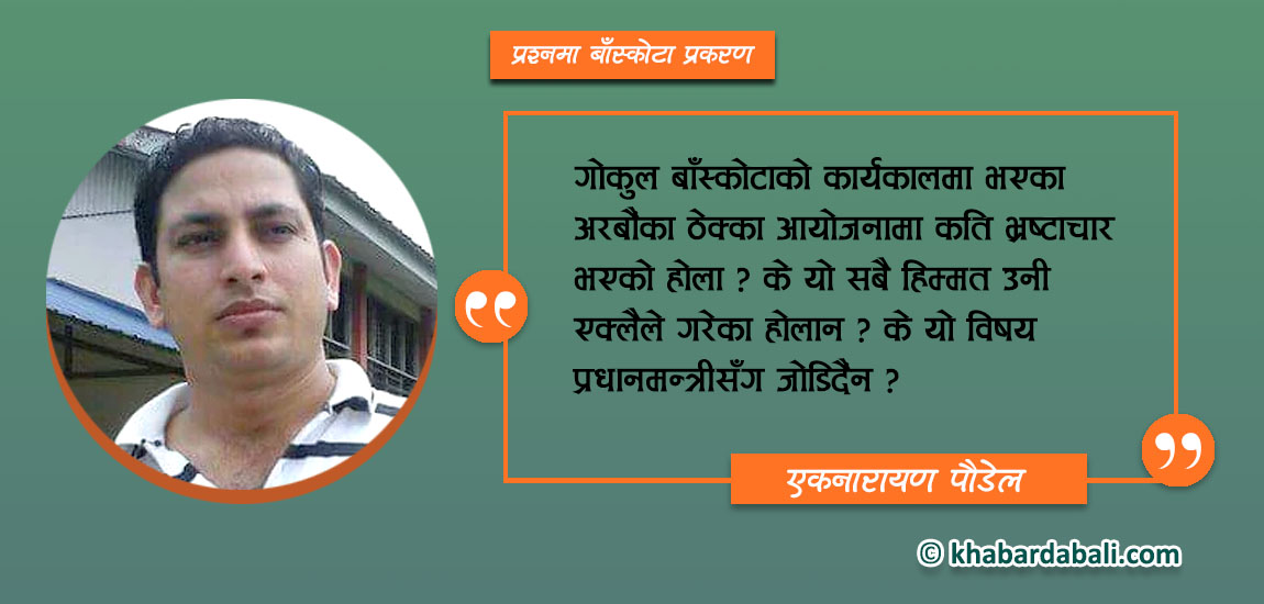 तर सँगै गम्भीर प्रश्न उठेका छन्, गोकुल बाँस्कोटाको कार्यकालमा भएका अरबौंका ठेक्का आयोजनामा कति भ्रष्टाचार भएको होला ? के यो सबै हिम्मत उनी एक्लैले गरेका होलान ? के यो विषय प्रधानमन्त्रीसँग जोडिदैंन ? प्रधानमन्त्री ओलीको उदासीनता र झनै गएको हप्ता काभ्रेको प्रतिभा र राजनैतिक तुलो भन्दै गोकुल प्रवृत्तिलाई नै मलजल हुने गरि उक्साउनुले शंकाको सुईले के सीमा नाघेकाे छैन् । सरल प्रश्न उठेकाे छ, याे काण्डमा के प्रधानमन्त्री ओेलीलाई छानबिन गर्नु पर्दैन् ।
