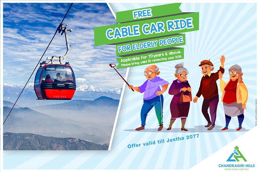 काठमाडौं । ज्येष्ठ नागरिकहरुको सम्मानका लागि चन्द्रागिरि हिल्स लिमिटेडद्वारा प्रवद्र्धित चन्द्रागिरि केवलकारमा सेवा लिने ७० बर्ष नाघेका आन्तरिक तथा बाह्य पर्यटकलाई केवलकार सेवा निशुल्क प्रदान गर्ने भएको छ । ज्येष्ठना गरिकहरुको भ्रमणलाई उत्साहित बनाउने उद्देश्यले निशुल्क सेवाको योजना ल्याइएको चन्द्रागिरी हिल्सले जनाएको छ ।