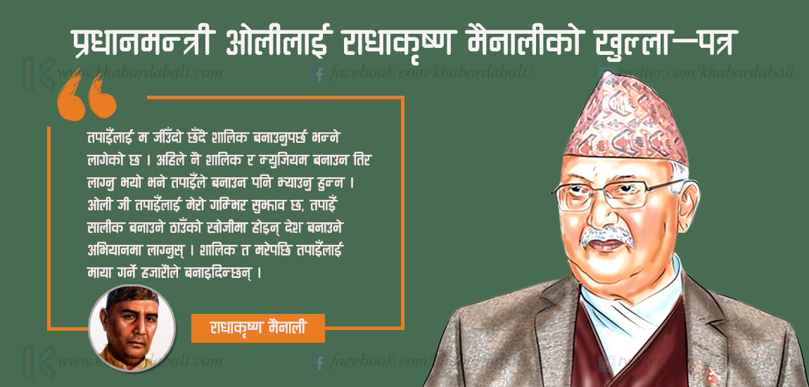 तपाईँले चुनाव अघि व्यक्त गर्नुभएको वाचा पुरा गर्नुभयो वा भएन त्यो जनताले भोलि अवश्य मुल्यांकन गर्नेछन् तर पनि म तपाईँको पूर्व एक हितैसी मित्रको नाताले पछिल्लो समय नेकपाभित्र जुन बिग्रह शुरु भएको छ, त्यो एकदमै गलत छ । तपाईँ पहिले जुन स्प्रिडमा पार्टी एकता गर्नुभएको थियो, पछिल्लो समय त्यो कदमबाट पर हट्न खोज्नुभएको छ । तपाईँ पार्टी बनाउनभन्दा पनि सत्तामा जाने मोर्चा बनाउनुभयो । सत्तामा जाने मोर्चा बनाउन ६/७ जानाबीच स्वार्थको बाँडफाँड गर्नुभयो । पार्टीलाई सत्तामा जाने भर्याङ बनाउनुभयो । ओली जी तपाई दुईतिहाइको शक्तिशाली प्रधानमन्त्री भइहाल्नुभयो, अब कसले भ्याउने ।