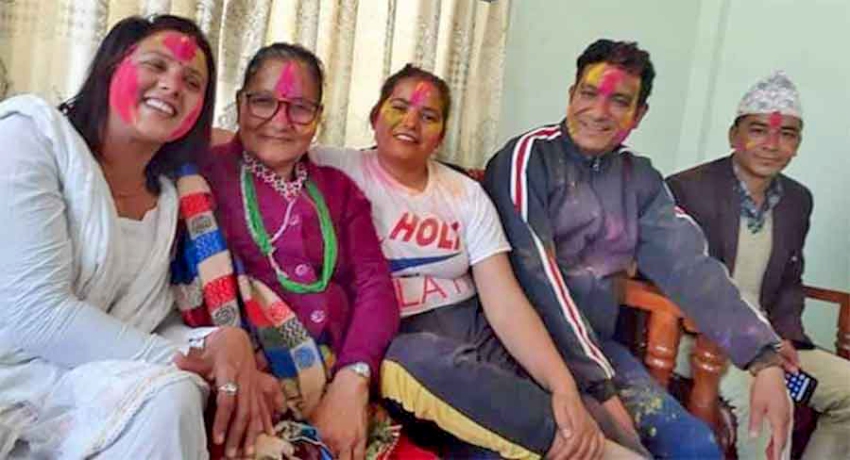 साविकको माओवादीबाट नेकपाको सुदूरपश्चिम प्रदेश कमिटि सदस्य रहेकी लक्ष्मी शाह, सहितका तीनजना महिला र एकजना पुरुषले होली खेलको हुन् ।