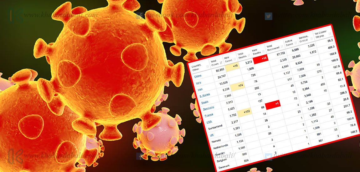 आधिकारिक स्रोतहरूबाट एएफपीले सङ्कलन गरेको तथ्याङ्क अनुसार, आइतबारसम्ममा विश्वभर ६ हजार ४२० जनाको मृत्यु भएको छ भने एक लाख ६३ हजार ९३० जना बिरामी भएका छन् । यो रोग विश्वका १४१ मुलुकमा देखिएको छ ।