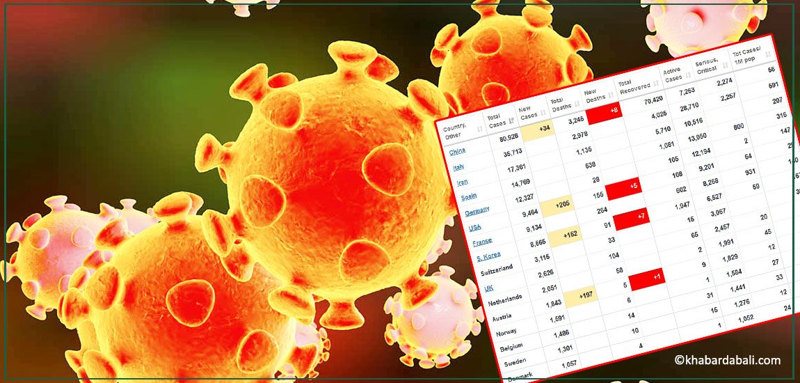 जनाइएअनुसार हालसम्म ८ हजार ९ सय ५१ जनाले कोरोनाबाट ज्यान गुमाएका छन् । विश्वका १७६ मुलुकमा देखिएको कोरोनाबाट बिहिबारसम्म २ लाख १९ हजार ३८५ मानिस संक्रमित भएका छन् । जनाइएअनुसार पछिल्लो २४ घण्टामा मात्रै २० हजार ५ सय ८४ जना थप नयाँ कोरोना संक्रमित भेटिएको उल्लेख छ ।