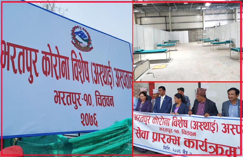 काठमाडौं । चितवनको भरतपुरमा ७२ घण्टामै कोरोना विशेष अस्पताल निर्माण गरि सेवा पनि सुरु भएको छ । भरतपुर महानगरपालिका–१० स्थित चितवन प्रदर्शनी केन्द्रमा अस्पताल निर्माण भएको हो ।