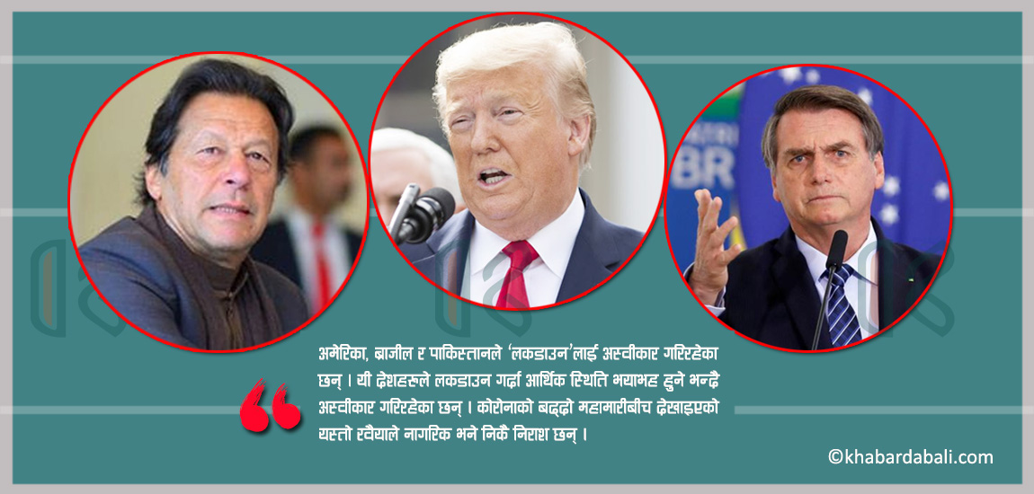 तर विश्वका केहि त्यस्ता छन् जसले लकडाउनलाई पुरै इन्कार गरेका छन् । अमेरिका, ब्राजील र पाकिस्तानले लकडाउनलाई अस्वीकार गरेका छन् । यी देशहरुले लकडाउन गर्दा आर्थिक स्थिति भयाभह हुने भन्दै लकडाउनलाई अस्वीकार गरिरहेका छन् । देशका प्रमुखहरुको यस्तो रवैयाले नागरिक भने निकै निराश छन् ।