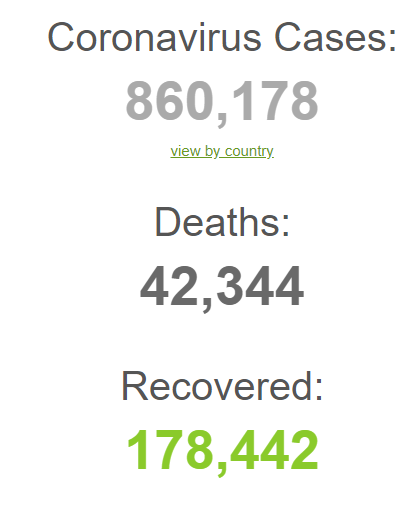 एजेन्सी । कोभिड–१९ नाम दिइएको प्राणघातक कोरोना भाइरस सङ्क्रमणबाट विश्वभरीमा ज्यान गुमाउनेको सङ्ख्या ४२ हजार ३४४ पुगेको छ । पछिल्लो विवरणअनुसार संंसारभर आठ लाख ६० हजार १६६ जना कोरोना भाइरसबाट सङ्क्रमित भएका विश्व स्वास्थ्य सङ्गठनले आज सार्वजनिक गरेकोे छ ।
