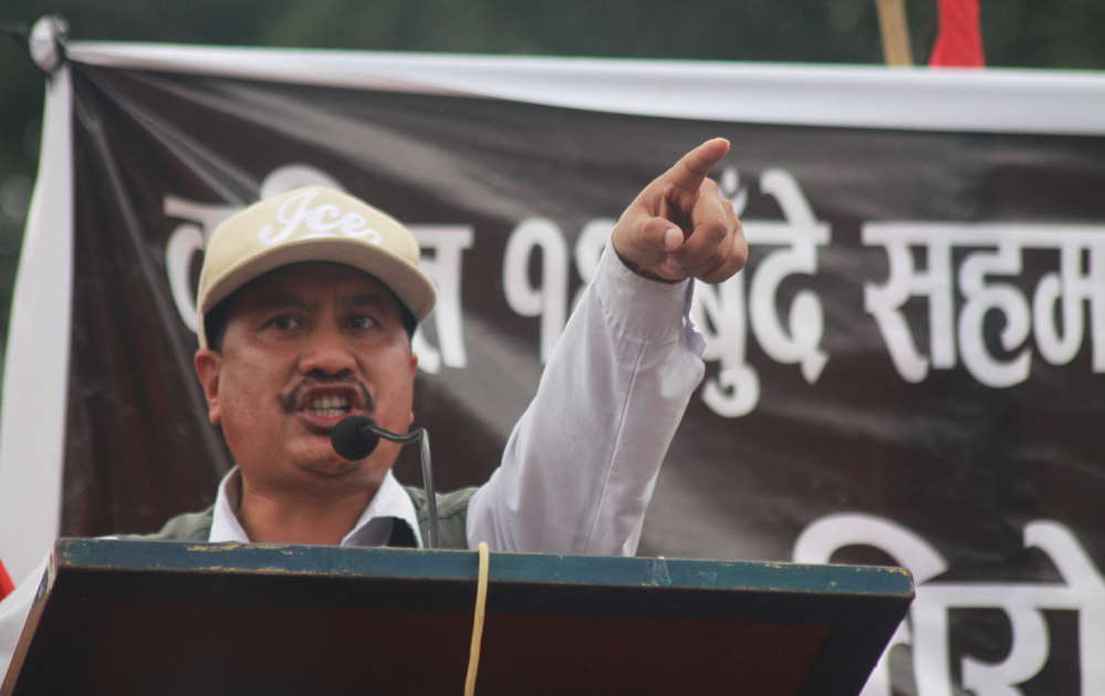 \"IMG_4354\"२५ असार, काठमाडौं । उद्घोषकले मौसमको चापका कारण भन्दै कार्यक्रम निकै छोटो गर्ने संकेत गर्दै थिए ।  विप्लव माओवादीका नेता धमेन्द्र बास्तोला बोल्दै थिए । आइचरको माथि दुई कुर्सी थिए । एउटामा विप्लव थिए, सँगै तिलक परियार । वास्तोलाले बोलेपछि सञ्चालकले विप्लवतिर इशारा गर्दै गर्दा रत्नपार्कमा छुट्टै उत्साह छायाे । रक्तरन्जित भेषमा सजिएका उनका कार्यकर्तालाई विप्लवले संबोधनको सुरुवात गर्दै गर्दा ताली पिट्न हतार हुन्थ्यो । भाषणको सुरुवातमै राज्यमाथी तिखा शब्दहरुको प्रहार गर्न थालेका उनले करिब पौने घण्टा सम्म सम्बोधन गरे । ‘नेपालको राष्ट्रियता माथि प्रश्न उठेको छ । नेपाली जनताको अधिकार माथि प्रश्न उठेको छ ।’ विप्लव बोल्दै चार दलबीच भएको १६ बँदे सहमति माथि खबरदारी गर्दै थिए, ‘जनताको अधिकारमाथि सिंहदरबार र विआईसीसीमा बसेर षड्यन्त्र हुँदैछ ।’ विप्लवले यसो भन्दै गर्दा कार्यकर्तामा तालीको पारो बढ्दै जान्थ्यो ।  विप्लव झनै जोसीदै जान्थे । ‘हाम्रो देशको अस्मिता माथि कुनै पनि देशले आँखा लगाउन पाउँदैन । हाम्रो पुर्खाहरुले टिकाएको हाम्रो देश माथि कसैले गिद्धे दृष्टि नलगाओस्,’ विप्लव भन्दै थिए, ‘हामी युवाहरु  देशको सार्वभौमिकताको पक्षमा लड्दै छौं । तर सरकारले सुनीरहेको छैन । सरकारले देखिरहेको छैन ।’ विप्लवको यस्तो वाक्य फूट्दै गर्दा उनका कार्यकर्ता सिटि फूक्थे । उनी झनै जोसिदै थिए । पसिना आउँदै थियो । विप्लव एक हातले औंला ठाडो पार्दै अर्को हातले पसिना पुछ्दै भन्दै थिए, ‘ राज्यले जनतालाई माग्ने बनायो, रैती बनायो ।’ निकै आक्रमक बनेका उनी राज्यलाई रत्नपार्क बाटै चुनौति दिँदै थिए, ‘नेपालीहरुलाई हेप्नेहरु माथि रत्नपार्कको राता माओवादीहरु राज्यका लागि चुनौती हो, ।’ सेतो सर्ट, र हाप ज्याकेटमा देखिएका उनी पटक पटक जोसीन्थे ।  भारत र चीनले गरेको लिपुलेक सम्झौतामा नेपाली भूमिको अतिक्रमण भएको भन्दै उनले रत्नपार्कबाटै चुनौति दिए, ‘नेपाली जनतालाई एक बचन पनि नसोधीकन जसरी लिपुलेक सम्झौता गरियो, भारत चीन तिमीहरु धनि हौला, शक्तिशाली हौला तर बेइजिङ र दिल्लीमा नेपाली जनताको स्वाधिनताको निर्णय गर्ने अधिकार तिमीहरुसँग छैन ।’ उनले भारत र चीनले लिपुलेक सम्झौता गरेको दुई महिना सम्म सरकार नबोल्नुले राज्य गुलाम तिर लागेको स्पष्ट पारे । ‘नेपाली जनतालाई दमन गर्न नेपाली जनतामाथि षड्यन्त्र गर्न राती कानुन बनाउने, विदेशी हेप्ता राज्य चुपो लागेर बस्ने ?’ उनले प्रश्न गरे, ‘तिमीहरुलाई देशको माया छ भने किन बोल्दैनौ ? सरकार तिमी के भिकारी हौ ? के तिमीलाई सत्ता जान्छ भन्ने डर छ ?’ उनले आफूहरुले सिमानामा झण्डा गाडेरै छाड्ने उद्घोष गरे ।  सरकारले सशस्त्र प्रहरीलाई गोली हान्