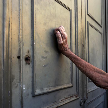 पेन्सन लिनको लागि नेशनल बैंकको शाखा कार्यालयको ढोकामा अडेस लिँदै गरेको वृद्धको देखिएको हात । तस्बिरः रोयटर्स \"pensioner1\"