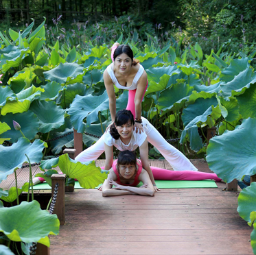 चीनको आनहुई प्रान्तमा अवस्थित जिलिङसान पार्कको लोटस पुलमा योगा गर्दै तीन युवती । तस्बिरः सिन्ह्वा \"yoga