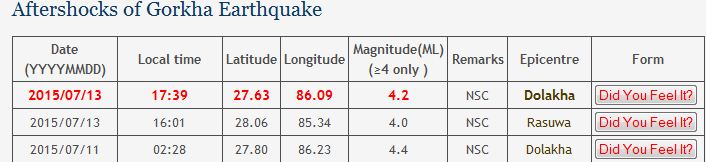 \"Bhuku\"२९ असार, काठमाडौं । फेरि भूकम्पका दुई झट्का गएका छन् । सोमबार एकदैन दुईपटक भूकम्पका झट्का गएका हुन् । राष्ट्रिय भूकम्प मापन केन्द्रका अनुसार सोमबार अपरान्ह ४ बजेर १ मिनेटमा रसुवालाई केन्द्र बनाए ४ रेक्टरस्केल र बेलुका ५ बजेर ३९ मिनेटमा दोलखालाई केन्द्र ४.२ रेक्टरस्ेकलको पराकम्पन गएको हो । आइतबार भने ४ रेक्टरमाथिका पराकम्पन गएन । १२ वैशाखको विनाशकारी भूकम्पपछि निरन्तर गइरहेको पराकम्पन अझै रोकिएको छैन ।