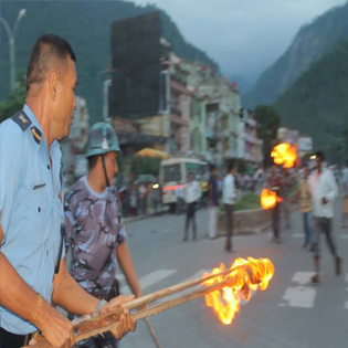 बुटवलमा मसाल जुलुसलाई अवरोध गर्दै मसाल खोस्दै प्रहरी । तस्विरः शिव डुम्रे/बुटवल \"Masal\"