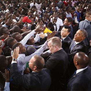 नैरोबीमा आयोजित एक कार्यक्रममा अमेरिकी राष्ट्रपति बाराक ओबामासँग हात मिलाउन कसरतमा सर्वसाधारण । तस्बिरः रोयटर्स \"nairobi1\"