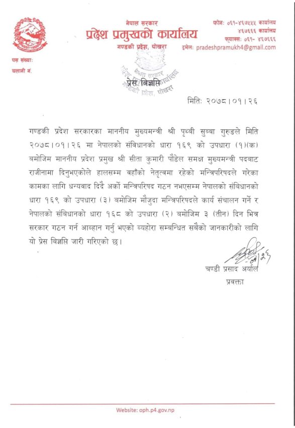 काठमाडौं । सत्ता संकट बेहोरी रहेका गण्डकी प्रदेशका मुख्यमन्त्री पृथ्वीसुब्बा गुरुङले दिएलगत्तै प्रदेश प्रमुख सिताकुमारी पौडेलले स्विकृत गरेकी छिन् । प्रदेश प्रमुख सीता कुमारी पौडेलले संविधानको धारा १६९ को उपधारा १ (क) बमोजिम गुरुङले दिएको राजीनामा स्वीकृत गरेकी हुन् ।