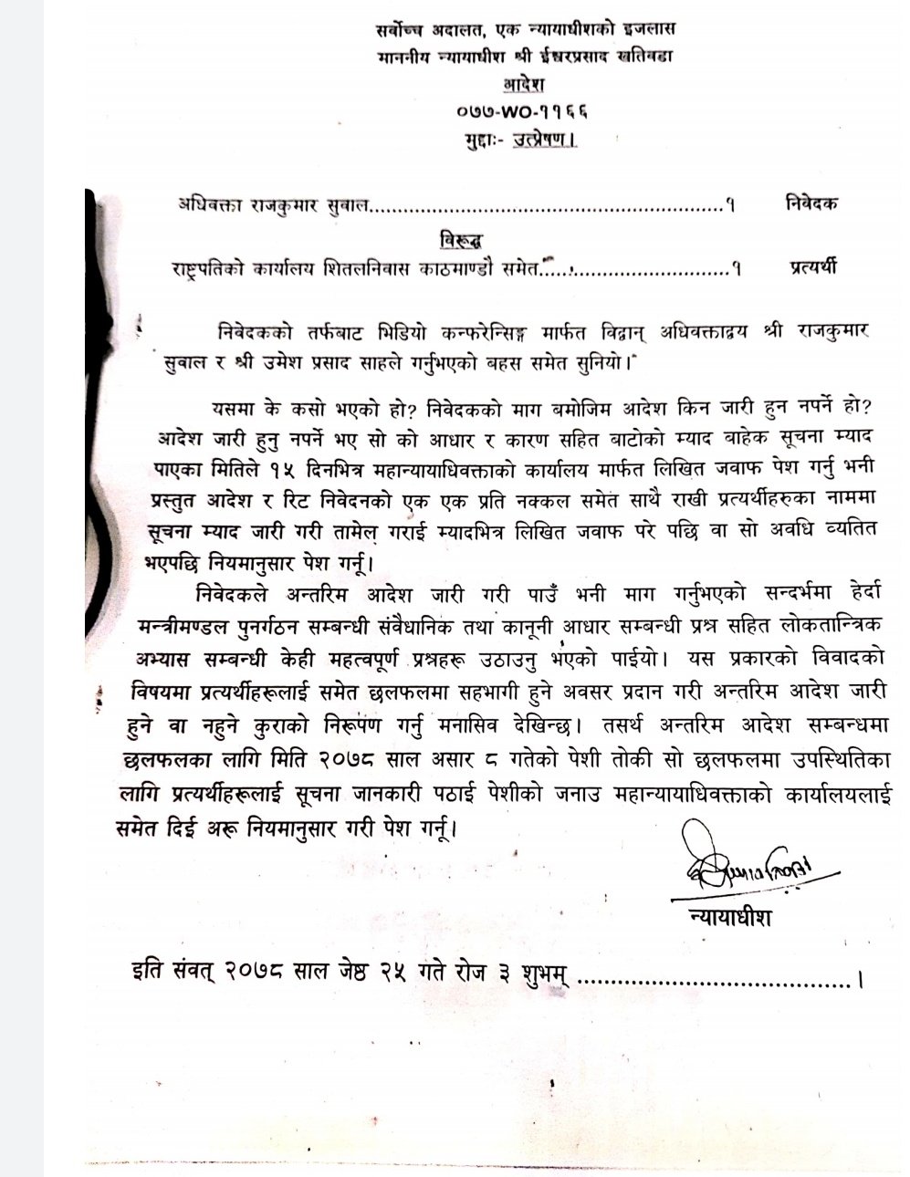 मन्त्रिपरिषद् पुनर्गठनमा अन्तरिम आदेश दिन माग गर्दै वरिष्ठ अधिवक्ता दिनेश त्रिपाठी र राजकुमार सुवालसहित ६ जनाले रिट दायर गरेका थिए ।