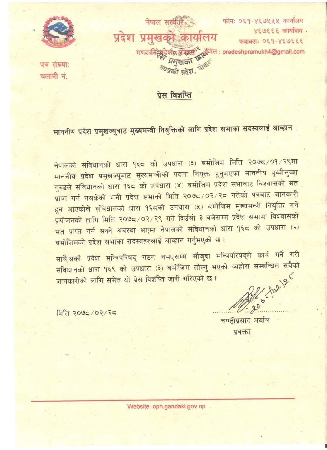 गण्डकीमा २४ घण्टाभित्र नयाँ सरकार गठनका लागि आह्वान गरिएको छ । शुक्रबार प्रदेश प्रमुख पौडेलले संविधानको धारा १६८ (५) बमोजिमको सरकार गठनको लागि आह्वान गरेकी हुन् ।