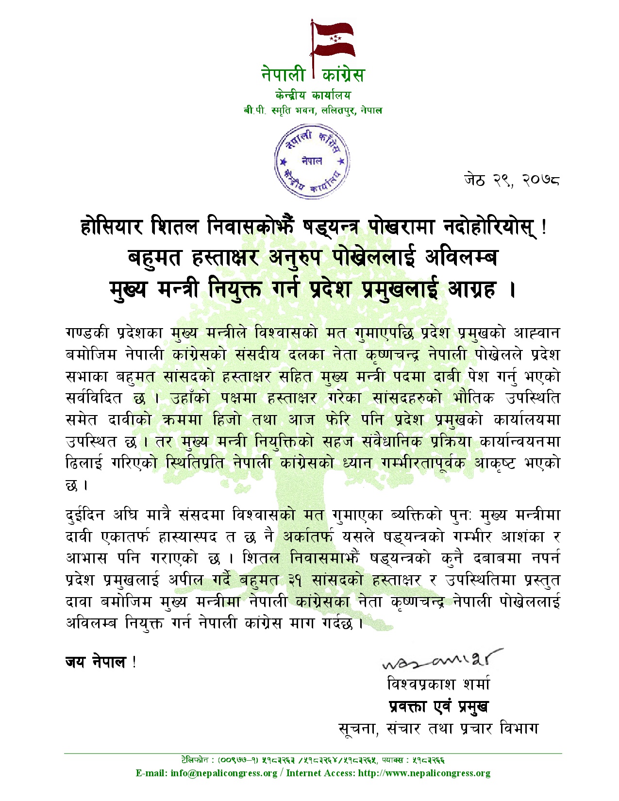‘गण्डकी प्रदेशका मुख्यमन्त्रीले विश्वासको मत गुमाएपछि प्रदेश प्रमुखको आह्वान बमोजिम नेपाली कांग्रेसको संसदीय दलका नेता कृष्णचन्द्र नेपाली पोख्रेलले प्रदेश सभाका बहुमत सांसदको हस्ताक्षर सहित मुख्य मन्त्री पदमा दाबी पेश गर्नु भएको सर्वविदित छ,’ विज्ञप्तिमा लेखेका छन्, ‘उहाँको पक्षमा हस्ताक्षर गरेका सांसदहरूको भौतिक उपस्थिति समेत दावीको क्रममा हिजो तथा आज फेरि पनि प्रदेश प्रमुखको कार्यालयमा उपस्थित छ । तर मुख्य मन्त्री नियुक्तिको सहज संवैधानिक प्रक्रिया कार्यान्वयनमा ढिलाई गरिएको स्थितिप्रति नेपाली कांग्रेसको ध्यान गम्भीरतापूर्वक आकृष्ट भएको छ ।’