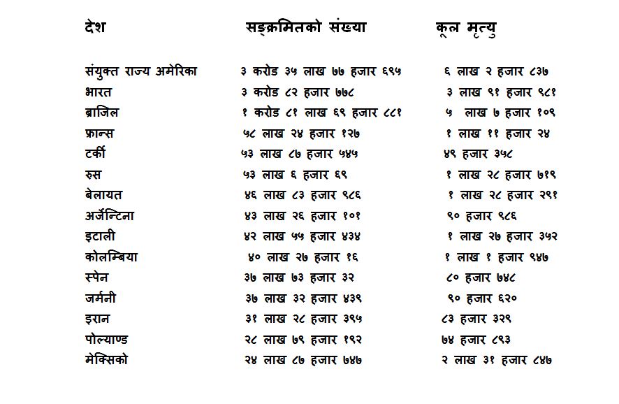 कोरोना शुरु भएयता हालसम्म विश्वभर यस सङ्क्रमणबाट ३८ लाख ९१ हजार ९४५ जनाको मृत्यु भएको छ ।