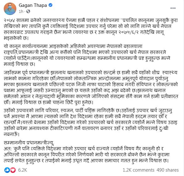काठमाडौँ । प्रधानमन्त्री शेरबहादुर देउवाले दिल्लीमा उपचाररत पूर्वप्रधानमन्त्री झलनाथ खनालको उपचारमा लाग्ने खर्च सरकारले बेहोर्ने भनेपछि काँग्रेस नेता तथा पूर्वस्वास्थ्यमन्त्री गगन थापाले सोको विरोध गर्दै आफ्नो फेसबुक मार्फत यी कुराहरु लेखेका छन् ।