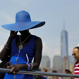 न्यूयोर्कको गर्मी दिनमा आफूलाई निलो ह्याटले ढाक्दै एक महिला । तस्बिरः रोयटर्स \"hat\"