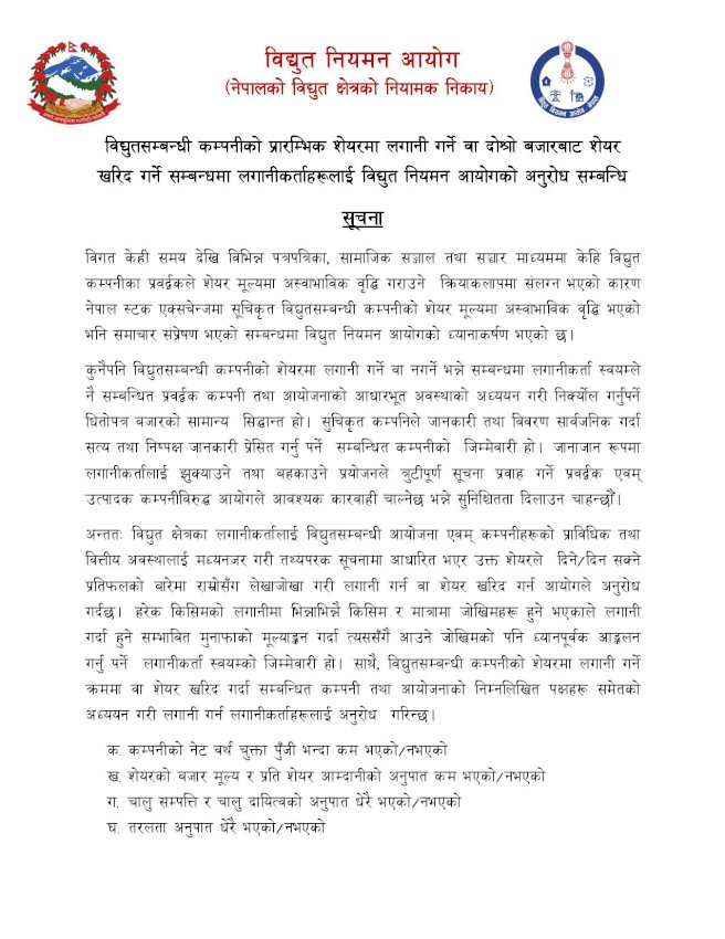 आयोगले लगानीकर्तालाई विद्युत्सम्बन्धी आयोजना एवं कम्पनीको प्राविधिक तथा वित्तीय अवस्थाको विश्लेषण गरी तथ्यपरक सूचनामा आधारित भएर उक्त शेयरले दिने वा दिनसक्ने प्रतिफलको बारेमा राम्रोसँग लेखाजोखा गरी लगानी गर्न अनुरोध गरेको छ । हरेक प्रकारका लगानीमा फरकफरक खालका जोखिम हुने भएकाले त्यसको ध्यानपूर्वक आंकलन गर्नु स्वयम् लगानीकर्ताको जिम्मेवारी भएको आयोगको ठहर छ । विद्युत् कम्पनीको शेयरमा लगानी गर्ने क्रममा वा शेयर खरिद गर्दा विशेष सावधानी अपनाउन आयोगले सबैलाई अनुरोध गरेको छ ।