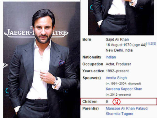 \"saifalikhan\"नयाँ दिल्ली । बलिउडका ‘छोटा नवाब’ भनिने सैफ अलि खान र नायिका करिना कपुर खान इन्डष्ट्रिका सबैभन्दा लायक जोडीको रुपमा चिनिन्छन् । विवाह पहिले सैफ करिना लिभ इन रिलेसनशिपमा थिए र त्यसको केही वर्षपछि उनीहरुले विवाह गरेका छन् । तर भर्खरै सेफको बालबच्चाके विषयमा एक खुलासा भएको छ जसका बारे सैफ आफैंलाई पनि थाहा नहोला । विकिपिडियाका अनुसार सेफ अलि खान दुई बच्चाका नभई ६ छोराछोरीका बुवा हुन् । जसलाई पढेर सबै अचम्ममा परे । हुन त यो कुनै ठूलो कुरा होइन । विकिपेडियालाई एडिट गर्न सकिन्छ । यहाँ तपाईं देख्न सक्नुहुन्छ कि सैफका ६ जना छोराछोरी छन् । यसका साथै, उनको जन्मको नाम साजिद अलि खान थियो भन्ने पनि हामीमध्ये कसैलाई पनि थाहा नहोला । यद्यपी, सैफ अलि खानबारे अहिले सर्च गर्दा उनका छाेराछाेरीकाे संज्ञा दुर्इ भनेर लेखिएकाे छ भने उनकाे नाम पनि सच्याइएकाे छ ।