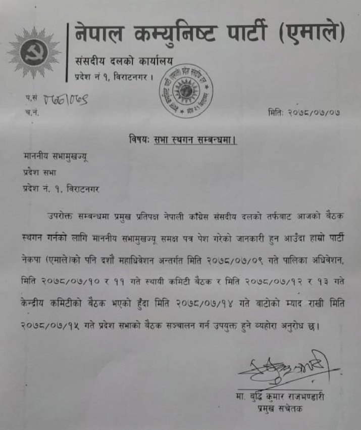 विराटनगर । आज आइतबारका लागि बोलाएको प्रदेश १ को प्रदेशसभाको बैठक स्थगित गर्न नेकपा एमाले र नेपाली कांग्रेसले माग गरेका छन् । दुवै दलले आजको प्रदेश सभा बैठक स्थगित गर्न सभामुख समक्ष माग गरेका हुन् ।
