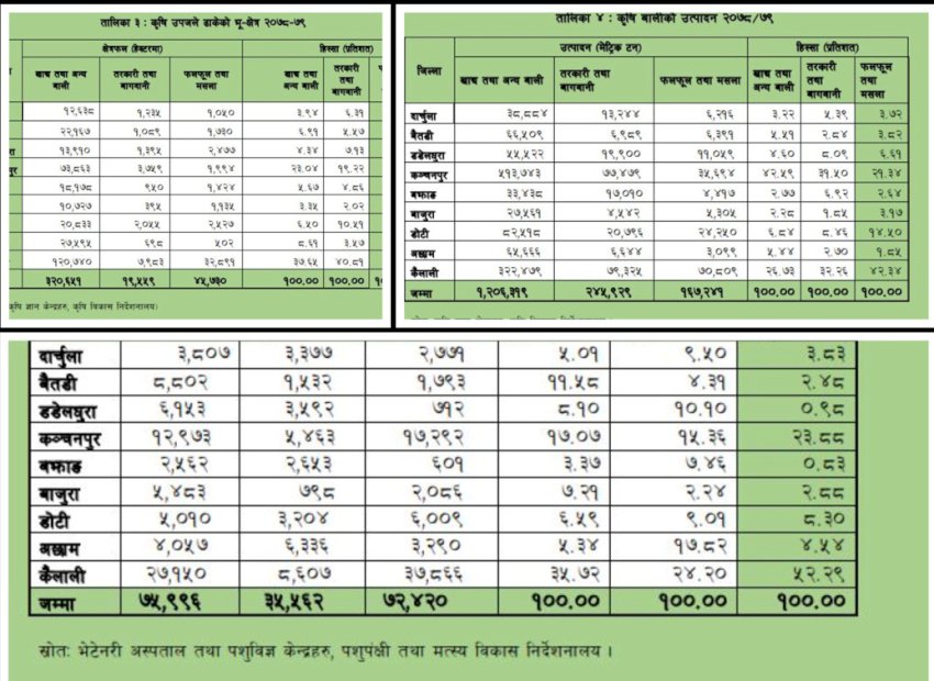केन्द्रीय बैंकले गरेको अध्ययनअनुसार तरकारीको समग्र उत्पादन सबैभन्दा बढी बझाङ जिल्लामा भएको पाइएको छ । उक्त जिल्लामा तरकारी उत्पादन ४९दशमलव८२ प्रतिशतले वृद्धि भएको छ । यस्तै अछाममा तरकारी उत्पादन ३४दशमलव२० प्रतिशतले घटेको छ । फलफूल तथा मसला बालीको समग्र उत्पादनमा छ दशमलव२५ प्रतिशतले बढेको छ ।