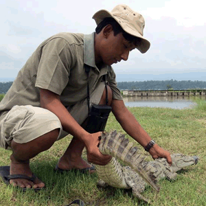 माछा पोखरीमा आएको गोहीलाई उद्वार गरी नवलपरासीको कावासोती–१३ मा रहेको नमूना मध्यवर्ती सामुदायिक वन समूहको भुताहाढाप घोलमा मगरगोही छोड्न लाग्दै संरक्षणकर्मी डिवी चौधरी । तस्बिर: विद्रोही गिरी, नवलपरासी–रासस \"gohi_photo\"