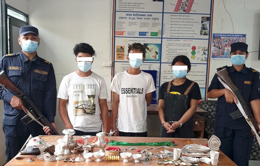 पक्राउ पर्नेहरूमा काठमाडौं गौरीघाट बस्ने सिन्धुपाल्चोक चौतारा घर भएका १८ वर्षीया किशोरी, सर्लाही लालबन्दी नगरपालिका–१६ घर भएका २० वर्षीय सिद्दार्थ बुढाथोकी र काठमाडौं खरिबोट बस्ने गुल्मी मुर्साकोट नगरपालिका–२ घर भएका २५ वर्षीय विष्णु पछाई रहेका छन् । असार २३ गते राति काठमाडौं महानगरपालिका–१ नक्साल नागपोखरीस्थित सन्तोषी माताको मन्दिरको ताल्चा फोडी करिब १२ लाख बराबरको सुन तथा चाँदीका गहना चोरी भएको घटनाको अनुसन्धान गर्ने क्रममा जिल्ला प्रहरी परिसर काठमाडौं तथा प्रहरी वृत्त मालीगाउँबाट खटिएको प्रहरीले उक्त कार्यमा संलग्न रही फरार रहेका उनीहरूलाई चोरी भएका विभिन्न सुन तथा चाँदीका गहना सहित पक्राउ गरेको हो । उनीहरूबाट सुनको तिलहरी, सिसा दानी, चुकुन्द, लकेट, बथनी अर्घ, ऐना र मुकुट १/१ थान, चाँदीको करूवा, पाता, गिलास र माला २/२ थान, दियो ५ थान, दियो बाल्ने ११ थान, कचौरा ४ थान, चम्चा ३ थान र १ सय २४ थान विभिन्न सिक्काहरू प्रहरीले बरामद गरेको छ ।