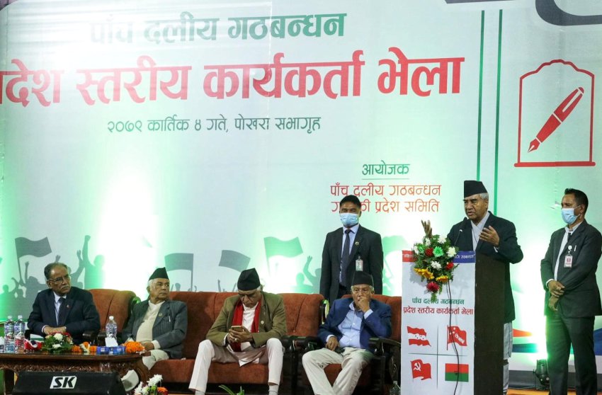 पाँच दलीय गठबन्धन गण्डकी प्रदेश समितिद्वारा पोखरामा आयोजित प्रदेशस्तरीय कार्यकर्ता भेलाको आज पोखरामा उद्घाटन गर्दै उनले संविधानको रक्षा, स्थिरता र समृद्धिका लागि गठबन्धन भएको स्पष्ट पारे ।