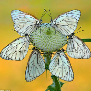 रोमको क्यास्टेली रोमानियन पार्कमा मायोनिले खिचेका तस्बिर । यसमा ६ वटा सेता पुतली एउटै फूलमा झुम्मिएका छन् । स्रोतः डेलीमेल \"Butterfly1\"