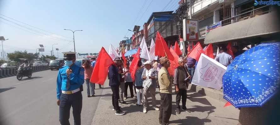 काठमाडौँ । नेपाल मजदुर किसान पार्टी ९नेमकिपाले राष्ट्रपति रामचन्द्र पौडेलले नागरिकता विधेयक प्रमाणीकरण गरेको विरोधमा आइतबार राजधानीमा जुलुस र धर्ना भएको छ । सीमा अतिक्रमण, भ्रष्टाचारलगायत विरुद्ध पनि सहभागीले प्लेकार्ड बोकेका थिए ।