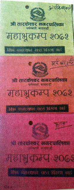 \"card\"भक्तपुर । गत वैशाख १२, १३ र २९ गतेको भूकम्पमा पूर्णरुपमा घर क्षति भएको विवरण भराएर भूकम्पपीडितको रातो कार्डसहित  १५ हजार लिने नक्कली पीडितको सङ्ख्या उच्च रहेको पाइएको छ । जिल्ला प्रशासन कार्यालयमा त्यस्ता ६०० व्यक्तिको जानकारी आइसकेको र अन्यको पनि प्रशासनले खोजी गरिरहेको छ । जिल्लामा भूकम्पले एउटा घर भत्किए पनि एकाघरका दुईदेखि चार जनासम्मले रातो कार्डसहित रु १५ हजार लिएको, बस्नका लागि एकभन्दा बढी घर भएका, यहाँ नबसी सहरको घरमा बस्दै आएका, गोठ तथा कुखुराको खोर भत्किएर क्षतिपूर्ति लिएका र घरमा क्षति नै नभए पनि क्षति भएको विवरण भराएर रातो कार्ड र १५ हजार लिनेको बिगबिगी रहेको खुलासा भएको हो । त्यस्ता व्यक्तिको नामावलीसहित गाउँगाउँबाट उजुरी आउन थालेपछि भक्तपुरमा नक्कली भूकम्पपीडितको खुलासा भएको हो । भक्तपुरका प्रजिअ तोयम रायाले अहिलेसम्म पूर्ण क्षतिको विवरण भराएर रकम लिने ६०० जना रहेको खुलासा भएको बताउँदै उनले उनीहरुलाई तत्काल रकम फिर्ता गर्न पत्राचार गरेको बताए । भक्तपुरमा ६०० भन्दा बढी नक्कली पीडितले रातो कार्ड बनाएर रु १५ हजार लिएको हुनसक्ने भएपछि जिल्लाका छवटै नगरपालिकाले गाउँगाउँमा सरकारको मापदण्ड विपरीत रकम लिनेलाई फिर्ता गर्न सात दिने सार्वजनिक सूचना टाँस गरेको छ । रकम फिर्ता नगर्नेलाई एकसाता पछि कारबाही गर्ने बताउँदै प्रजिअ रायाले केहीले रकम फिर्ता गर्न थालिसकेको बताए । अनन्तलिेङ्श्वर नगरपालिकामा आठ जनाले रकम फिर्ता गरेको र अन्य नगरपालिका तथा जिल्ला प्रशासनमै आएर रकम फिर्ता गर्न थालेका छन् ।