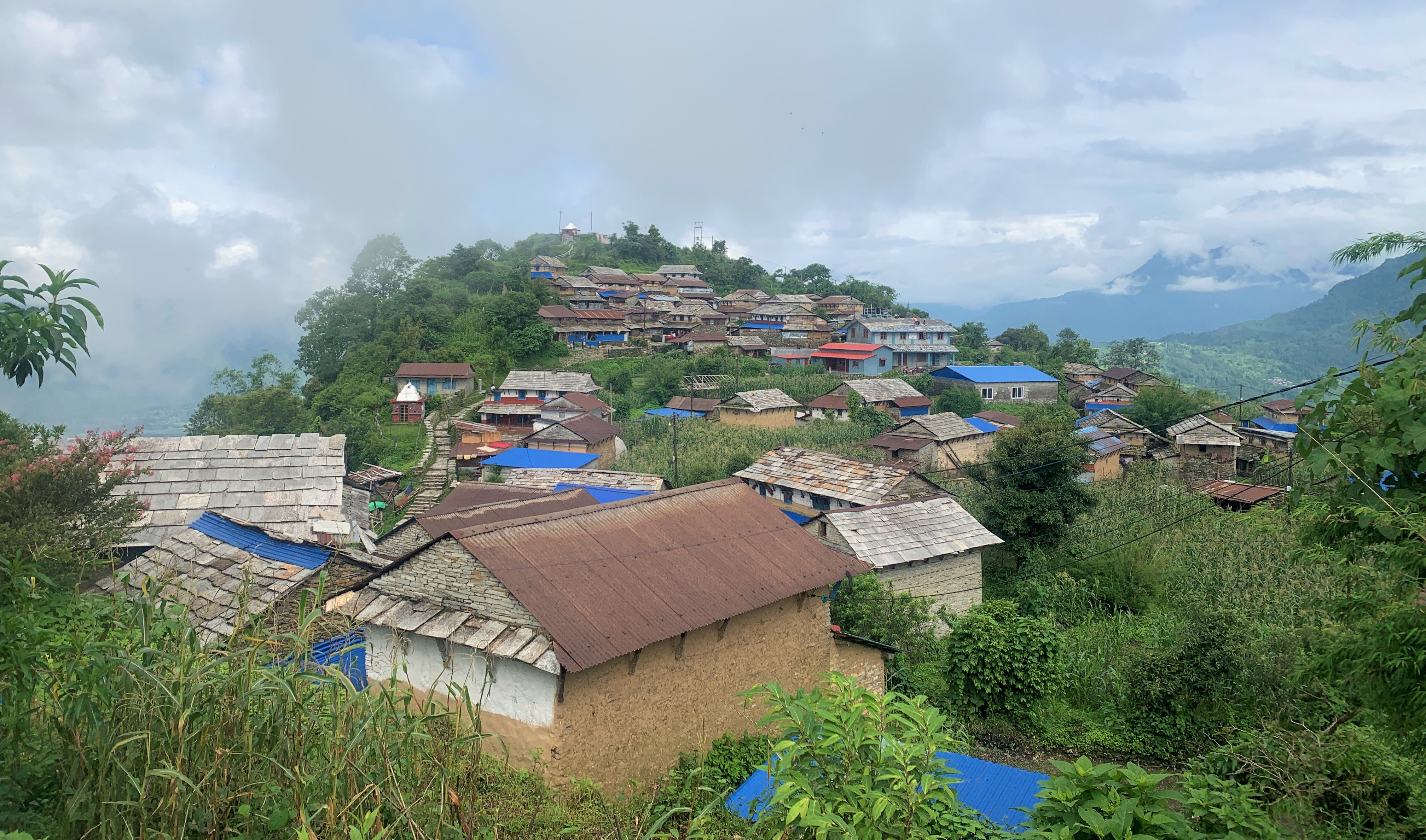 पोखरा । माथि हिमाल । तल पोखरा उपत्यका । थुम्कोमा अर्मलाकोट गाउँ । धेरै ढुंगाले बान्की मिलाएर छाएको छानो त केही जस्तापाताले छाइएका घर ।